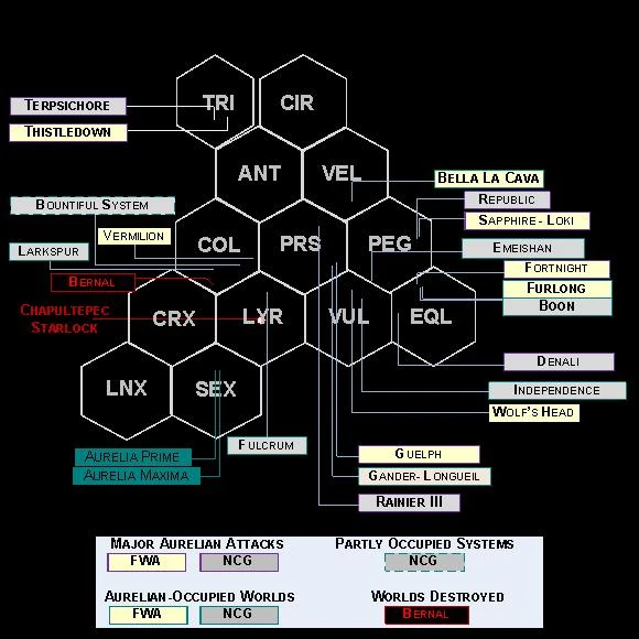 The Aurelian delegations conveyed the official position that the Commonwealth (and the Free Worlds) must accept and concede that these worlds were part of ‘Greater Aurelia,’ and make no attempt to free them. They presented a list of other worlds that would be ceded to Aurelia in the coming years that included the colonies of Vermilion, Key Lyra, Sierra Vela, New Hawthorne, Fortnight, and Fulcrum. In return, the remaining major worlds would not be attacked.